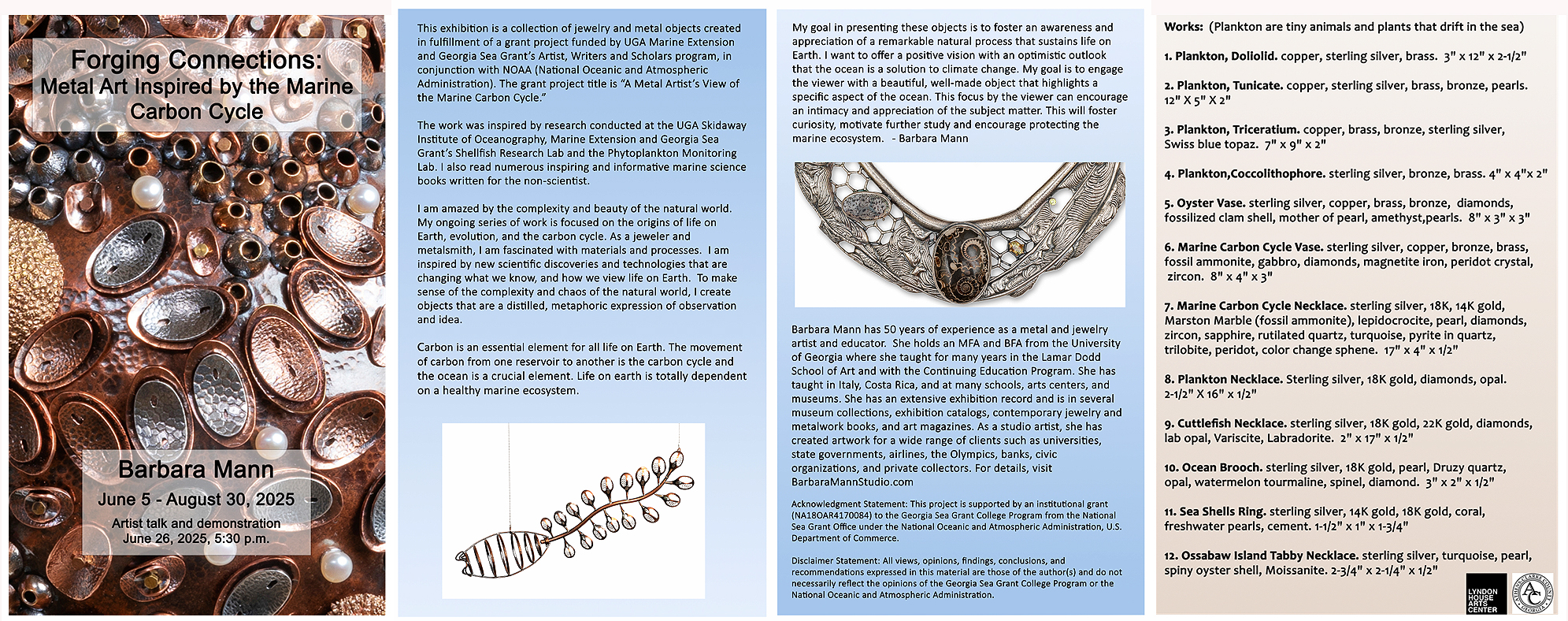 “Forging Connections: A Metal Artist’s View of the Marine Carbon Cycle.” Solo Exhibit June 5 to August 30, 2025. Lyndon House Arts Center, Athens, GA. Opening, Thursday, June 5, 2025, 5:30-7:30 pm. Barbara will be giving a talk and demonstration of her process on Thursday, June 26, 2025, at 5:30 pm.