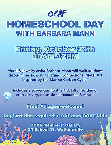 OCAF Family Day, Saturday, October 4, from 10am to noon. Activities include a scavenger hunt, artist talk with Q&A, a live demo where Barbara will melt and pour silver into a cuttlefish bone to create a small-scale object, and a hands-on activity using chasing and repousse techniques on copper to create a piece of art to take home.