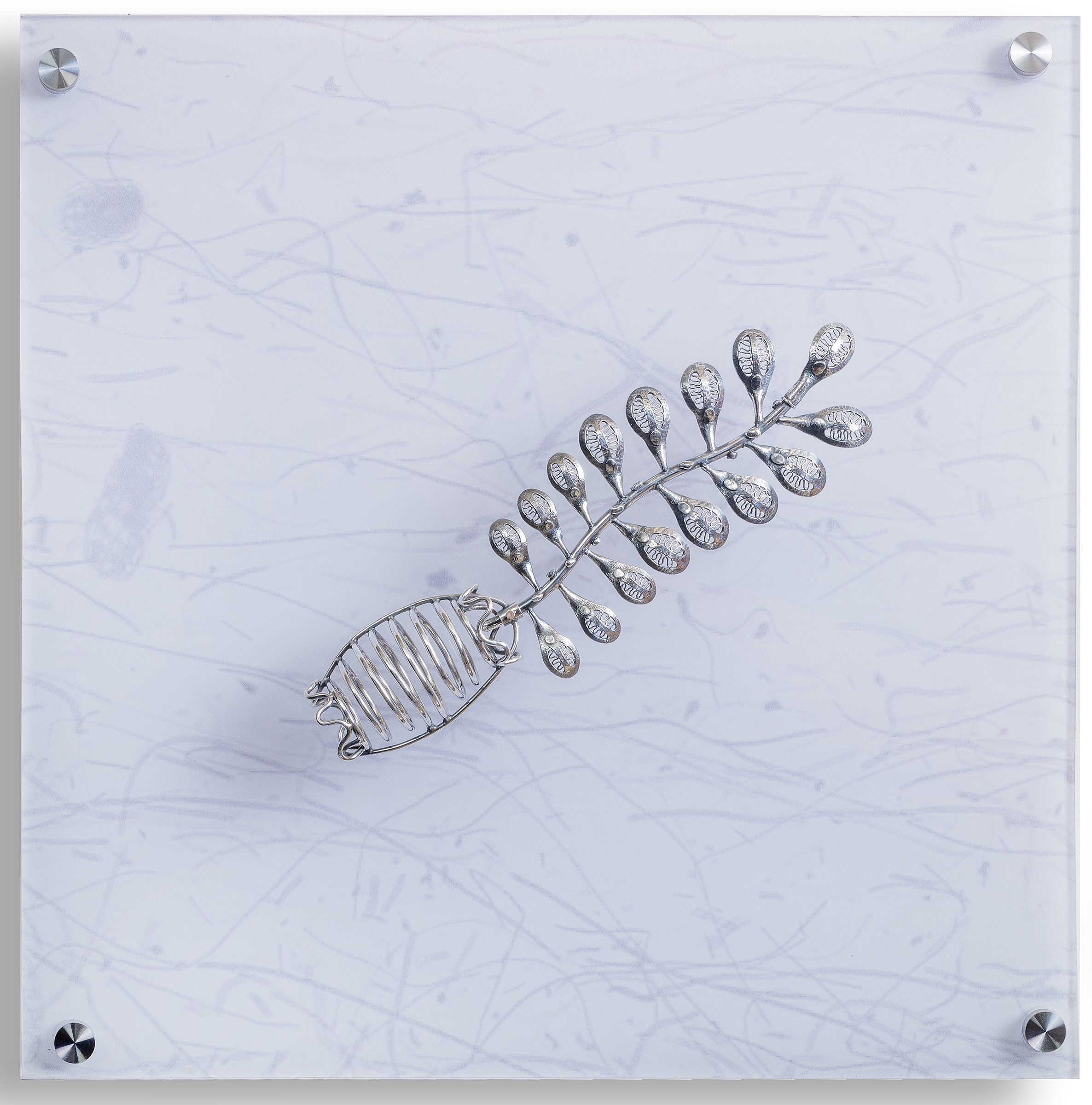 Doliolid Nurse Wall Piece 2— sterling silver on Lexan sheet displaying Dr. Adam Greer’s shadowgraph video images of doliolids and other plankton — see description at end of page