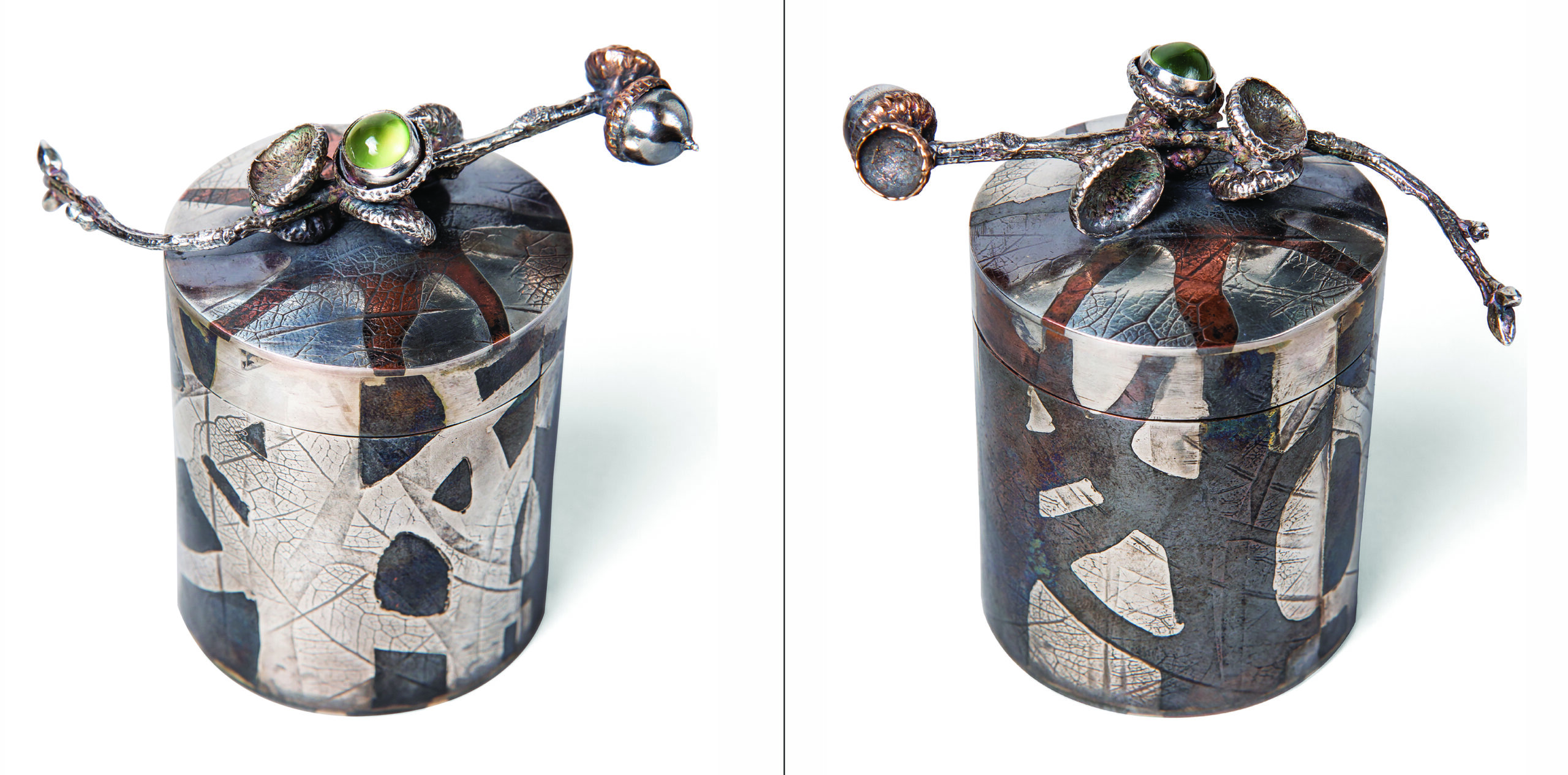 Heirloom Oak Seed Container was created to contain an oak seed from the ancient forest in Poland, Bialowieza, World Heritage site of one of the oldest groups of oak trees in the world.  Oak, a universal symbol of strength and endurance, is embedded in cultural landscape myth and memory.  I drew the oak trees in my yard and laid out the design to create a combination of silver and copper sheet metal. This technique known as married metals or metal mosaic requires soldering numerous pieces of metal together side by side. In this container, there are over 60 pieces. The sheet metal was roller printed with leaf textures, formed into a cylinder, soldered, the top and bottom soldered in place, a cut made around the circumference of the cylinder, and then a flange soldered in the bottom section of the cylinder. The top branch element was cast in silver and bronze from an oak twig in my yard.  I then set a peridot cabochon in the acorn cup suggesting new growth.