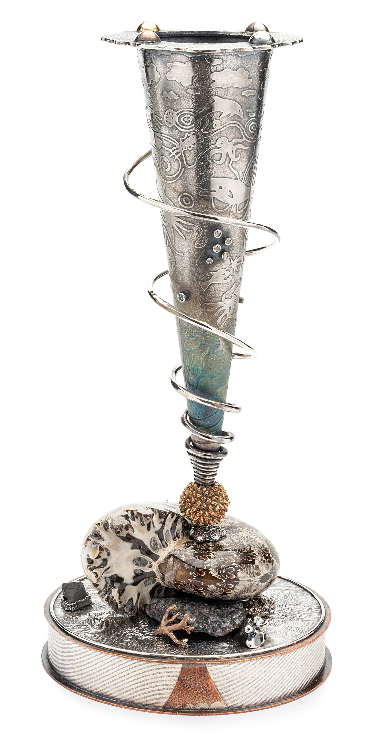 Marine Carbon Cycle Vase — sterling silver, copper, bronze, brass, fossil ammonite, gabbro, diamonds, magnetite iron, peridot crystal, zircon — see description at end of page