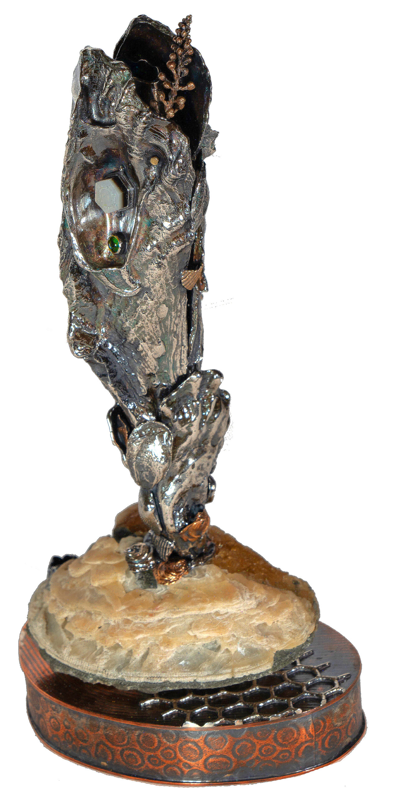 Plankton, Lorica of a Tintinnid Wall Piece — The microscopic, single-celled marine organism (a tintinnid ciliate) that I have represented is a Codonellopsis orthoceras, a microzooplankton, or “drifter.” They are a vital link in the aquatic food chain. They build a gelatinous, protective case (a lorica), around them which is conical or vaselike. Other mineral particles attach to the surface of the lorica; in my representation they are coccolithophores. The topmost part of my depicted lorica is fold formed copper.   copper, sterling silver, bronze, pearls.  5″ x 12″ x 2″