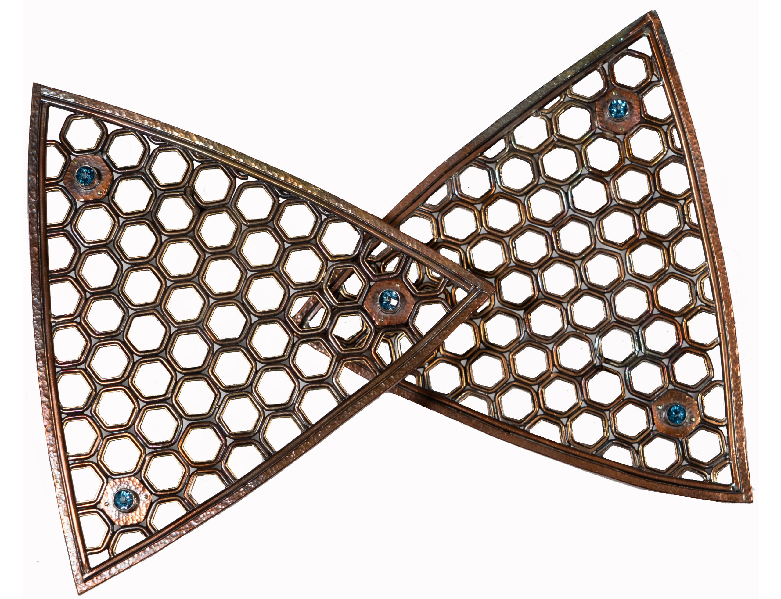 Triceratium Wall Piece — This piece represents two microscopic marine organisms (Triceratium favus)     copper, brass, bronze, sterling silver, Swiss blue topaz.    7” x 9” x 2″